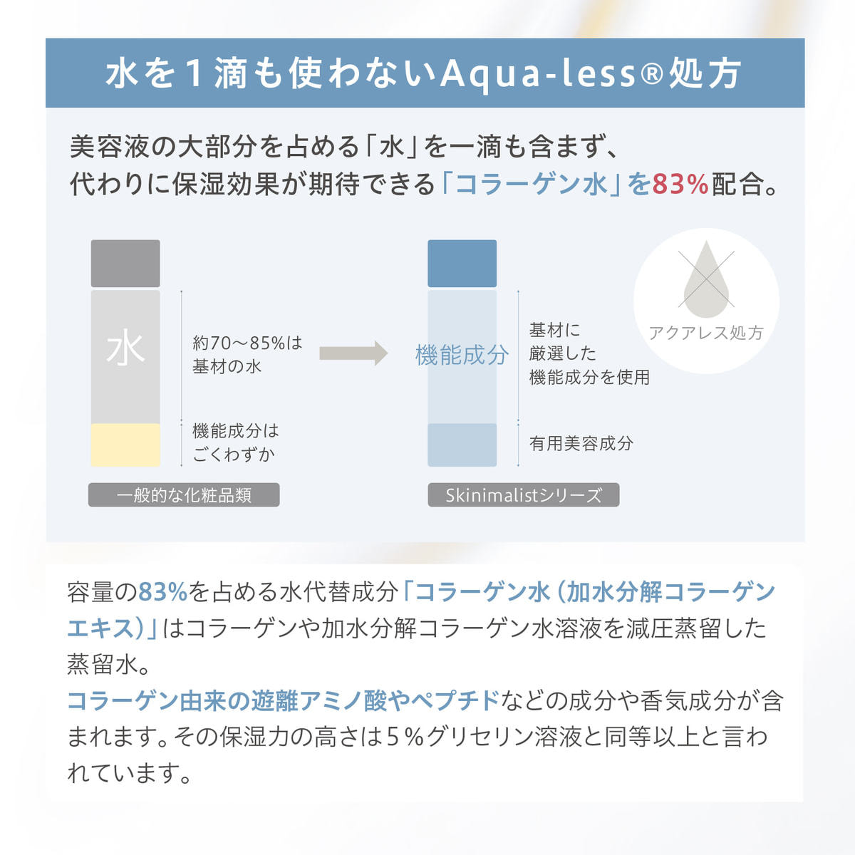 世界的に注目が集まるSkinimalism*( スキニマリズム)実現のために最新の美容成分を厳選し、新処方である“水を一滴も含まない”Aqua-less®(アクアレス)処方を採用。